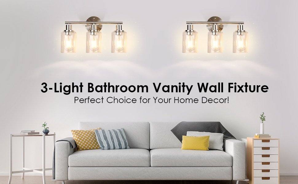 Brushed nickel finish combined with transparent glass shades that gently diffuses light when the fixture is illuminated, add an elegant touch and different taste to your home .Update your bathroom with one easy step.