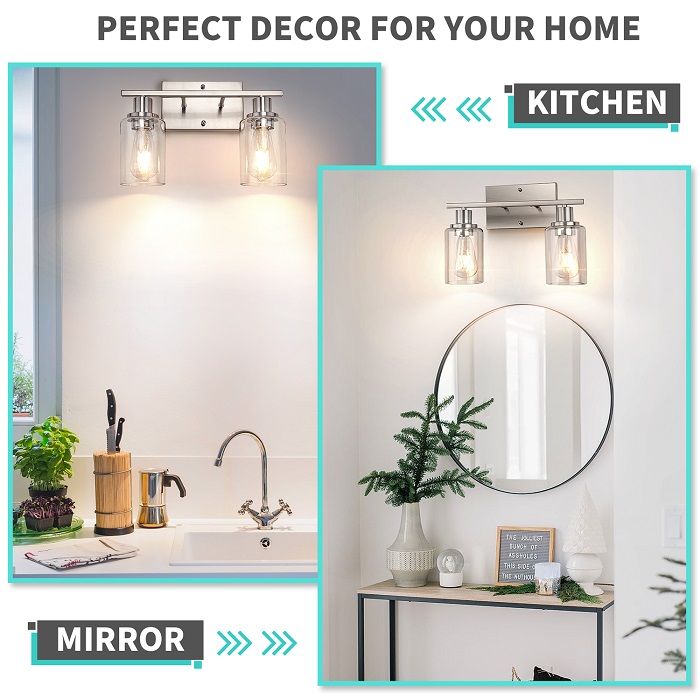 ✔ Premium Quality Material: The vanity light is designed with metal lamp body in a handsome brushed nickel finish and super transparent glass shades reflect and refract light to exquisite and opulent effect.
