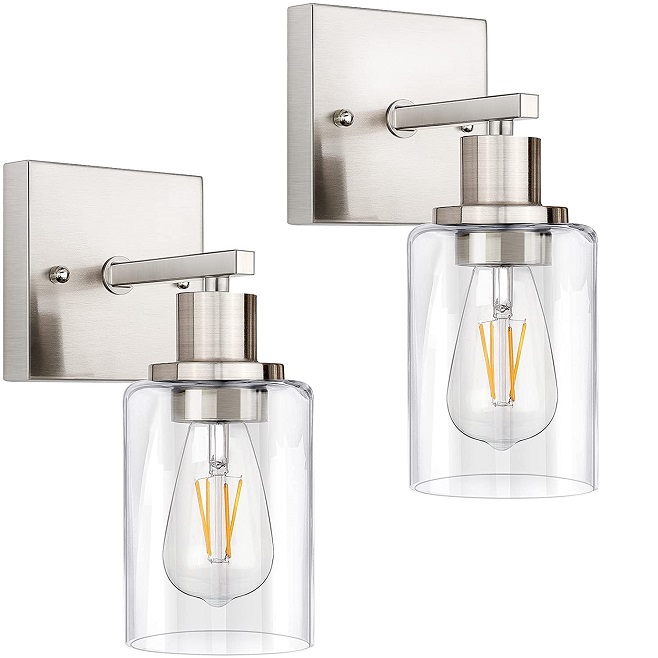 ➤ [Modern & Durable Construction]- Featuring a unique clear glass shade and modern style brushed nickel metal body without getting oxidation & color fading for years of use, ShineTech wall sconces always bring a minimalist shape and boasts accents, ideal for highlighting your space in eye-catching style. Perfect complement for top side of a mirror, bedroom, dinningroom, doorway or stairway. Note: You can purchase the same glass lampshade replacement if the shade is broken(ASIN: B08BNH3VGV). ➤ [E26 Standard Base Required]- Our 2 pack 1-light bathroom vanity light fixtures with standard USA socket is compatible with E26 medium base bulb(Bulb NOT INCLUDED), like LED, Incandescent, CFL, RGB, Halogen or Dimmable Bulbs (maximum 60W for each bulb). Its simplistic design will help it blend with different E26 bulb styles to bring you a different taste for your ambience. ➤ [Fantastic Size & Wide Application]- This brushed nickel bathroom light fixtures with the pefect dimenssion of glass shade:4" x 5.5"(L x H) and wall sconce:10.23" x 6.69"(H x W), which is an excellent choice for your bathroom mirror or bedroom, living room, dressing table, vanity table, mirror cabinets, doorway or entryway, corridor, foyer, bar coffee shop. Also, it can be used as wall mount light, reading lamp, vanity light, bathroom light, etc. ➤ [Easy & Quick Installation]- All mounting hardware required for installation are included in the package, just need to connect the wire, then place the glass shade and bulb. No on/off switch. No plug. With modern DIY function, our wall mount light can be mounted facing upward or downward to suit your needs. Also you can install it easier to for anywhere you like by yourself, no need to spending a big extra cost for an electrician. ➤[2-Years Free Warranty]- Please check the lampshade and all parts carefully after the lamp delivered. If there is any damage by transportation, please contact us via your order or Amazon message center, we will help arrange new replacement glass bathroom lighting/or a full refund for your 100% satisfaction within 24hrs. ASIN: B08QYPVSVV