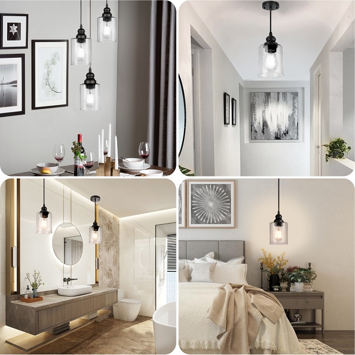 ➤ ¡¾Adjustable Height & DIY Design¡¿: The bathroom light fixtures come with three same cables length which can be adjusted by unscrewing the 3 tightening caps according to your preferences and design to fit your ceiling height needs. Overall length: 55.11 inch, wire length: 46.06inch. You can hang higher or lower as you want, a perfect choice for various hanging positions and compatible with different types of ceiling designs such as vaulted ceilings, sloped ceilings, and flat ceilings. ➤ ¡¾Industrial Style & Wide Application¡¿: The black metal retro hanging light mixing with power seeded glass shade, emits ample glow to brighten up the whole space, provide a timeless vintage touch and a clean modern aesthetic in your house. With the plain design, this wall light fits perfectly with any style decor from modern to the farmhouse which is a great idea for your bathroom, dressing table, mirror cabinets, vanity table, art display, dining room, kitchen, powder room, foyer, hallway,¡ ➤ ¡¾Fantastic Size & Easy Installation¡¿: This is our kitchen light fixtures size: Glass Shade Size(4.1'' D x 5.9'' H), Canopy Size(4.7'' D x 0.98'' H), Adjustable Cord(Maximum Length 46.06''). All mounting hardware and installation guide are included in the package for quick installation, just need to connect the wire and assemble the shade only. Moreover, with modern DIY functions, you could install and pack it up easier to anywhere you like by yourself, saving costs for hiring an electrician. ➤ ¡¾Bulb Requirements¡¿: You can use any E26 standard base bulbs (Max 60W for each bulb) such as LED, CFL, incandescent, and halogen bulbs. Bulbs are not included, need to purchase them separately. You can choose different style bulbs and color temperatures to create multiple atmospheres to your house. Our mini-pendant lighting fixture is also designed to be dimmable when used with a dimmable bulb and compatible dimmer switch. ➤ ¡¾No Worry To Buy¡¿: Our pendant lights featured with high-quality materials and sturdy seeded glass shades provides long-term durability. We are devoted to providing our customers great after-sales services with 2 years assurance and 30 days return for quality after delivery. If you have any questions, please feel free to contact us, we will make it right for you within 24hrs. ASIN: B08VDX1KKN